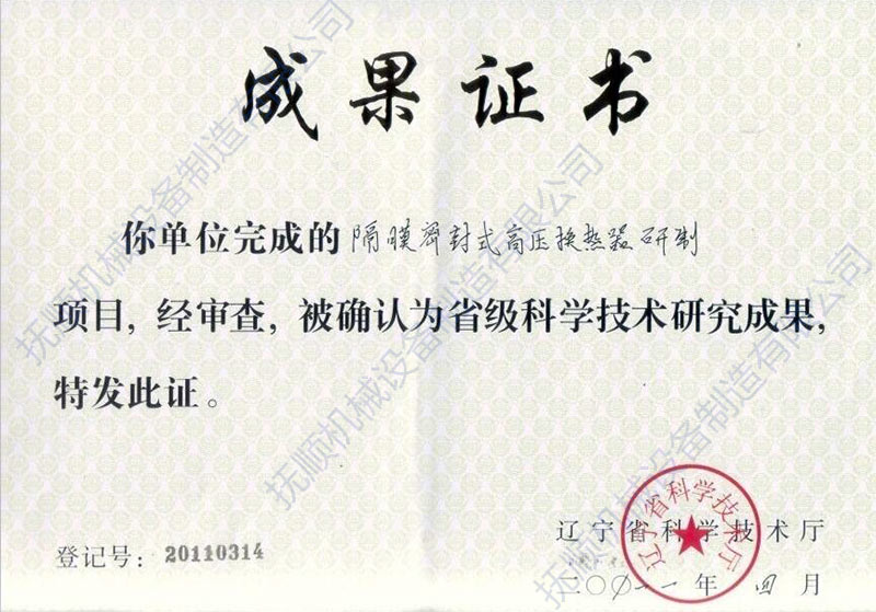 隔膜密封式高压换热器研制成果证书