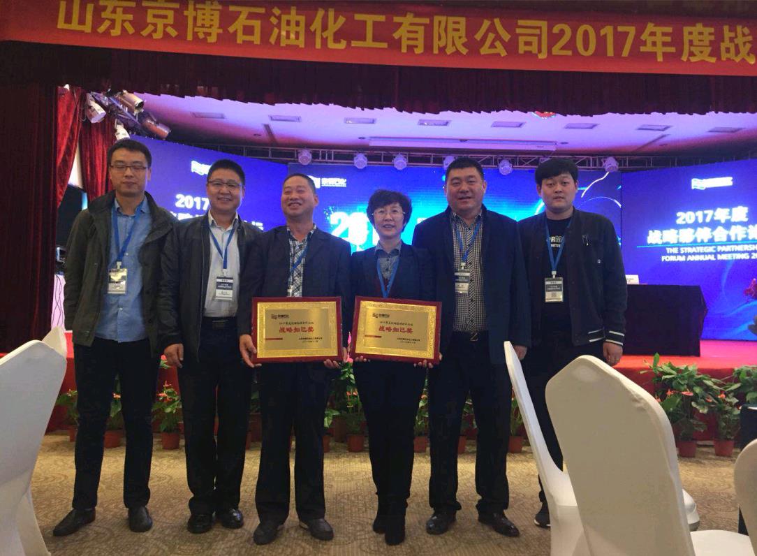 山东京博石油化工有限公司与开云·官方端网页版登录入口在2016—2017年度密切合作,总合作金额达3000万,自双方建立战略合作伙伴以来,抚机公司为京博石化提供了多种质量优质,产品高效的压力容器设备。2017年11月4日在山东京博石化有限公司举办的“2017年度战略伙伴合作论坛”上,抚机公司以其卓越的产品质量和突出的综合实力被京博石化光荣授予“战略知己”的荣誉称号。抚机公司副总经理齐军、市场部部长杨