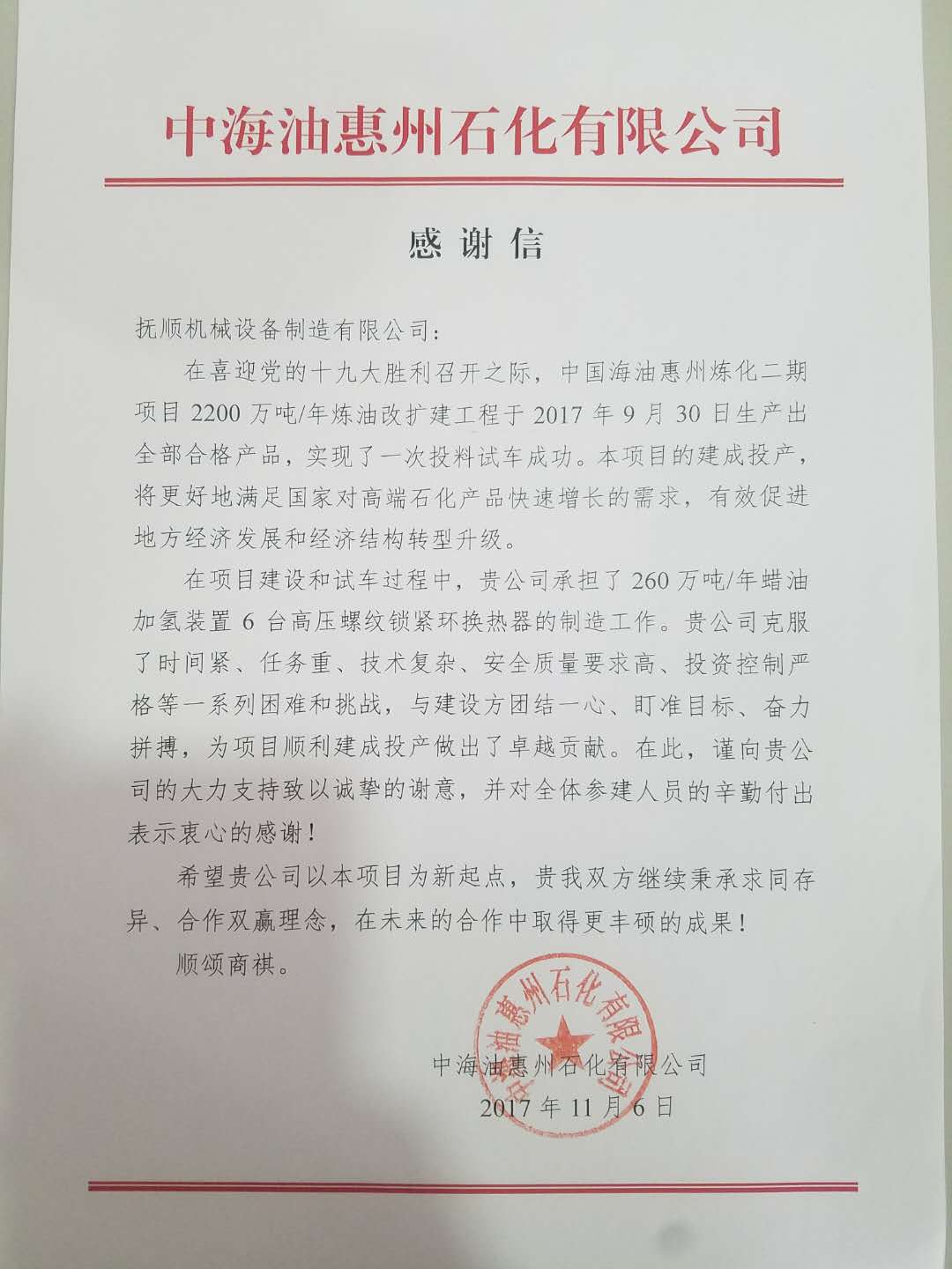 由抚机公司为恒河材料科技股份有限公制造的热聚树脂一段加氢反应器,经全公司员工共同努力下,于2018年1月全部竣工,检验合格,发货交付用户运行。